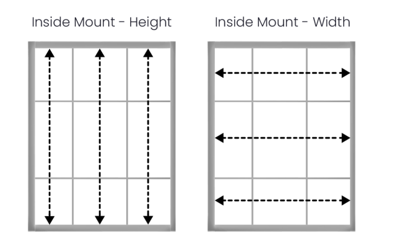 • Width: Measure the inside width from left to right in 3 places (top, centre and bottom of the window). Use the narrowest measurement and deduct 10mm for clearance.