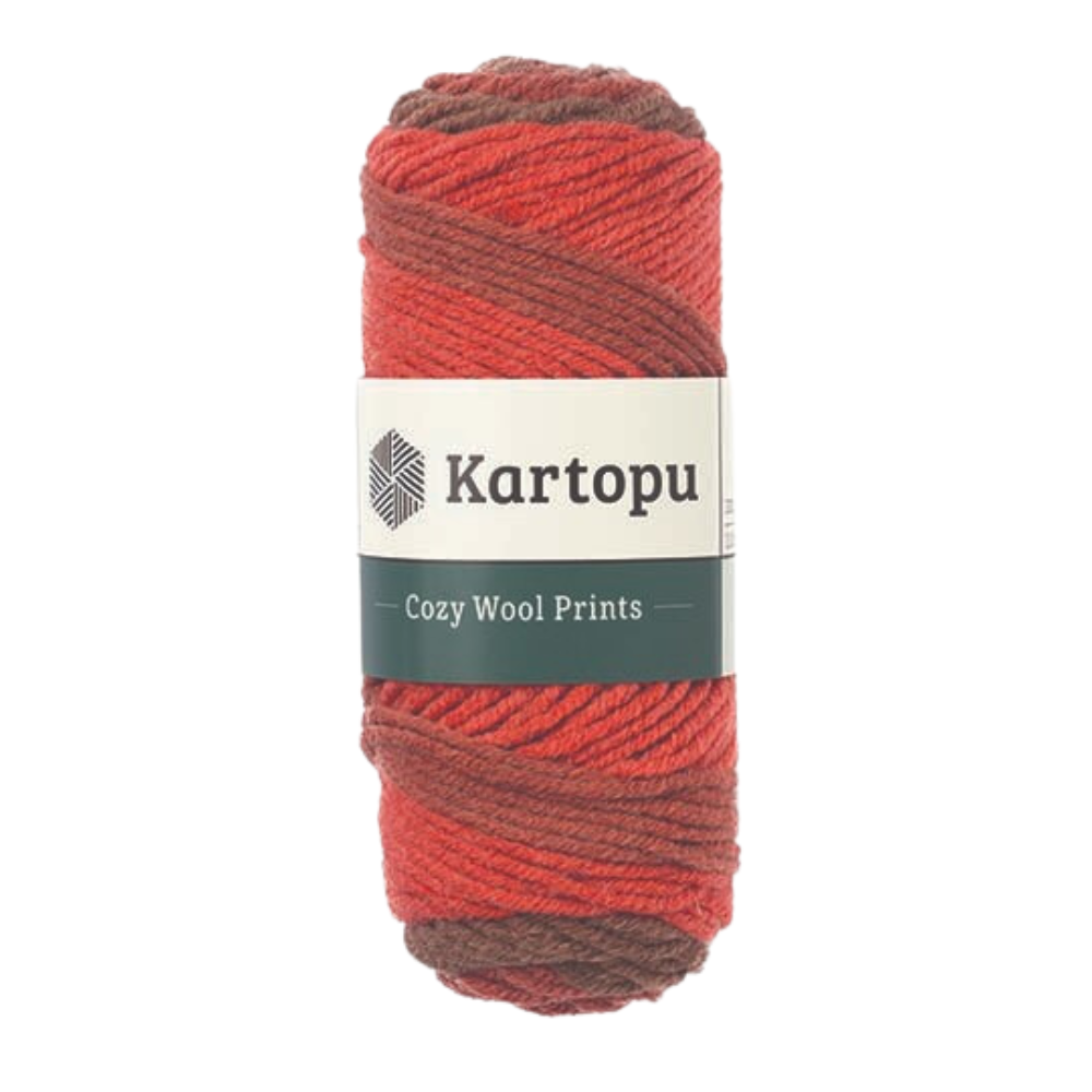 Kartopu Cozy Wool Prints is a bulkyweight yarn that is ideal for winter garments and accessories. It is made of 75% acrylic and 25% wool, which gives it a soft and warm feel with a natural wool touch. It is great for people who don’t like intensive wool content but love wool fibre texture. It comes in many beautiful colours with selfstriping effects that create stunning patterns as you knit or crochet. Kartopu Cozy Wool Prints has a meterage of 110 meters per 100 grams, and it works well with needle sizes ranging from 7 to 8 mm and hook sizes from 6 to 7 mm. Kartopu Cozy Wool Prints is a cosy and colourful yarn that will make your winter projects cosy and fun.