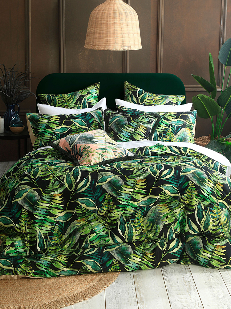 It has dark undertones slathered in green leaves with tinges of a golden shade throughout. Tropics Duvet Cover Set is easy to care for. Warm, gentle machine wash separately before use. Wash dark colours separately. Remove promptly from the machine. Do not bleach. Do not tumble dry. Warm iron if required. Do not dry clean. It includes a duvet cover and two pillowcases.